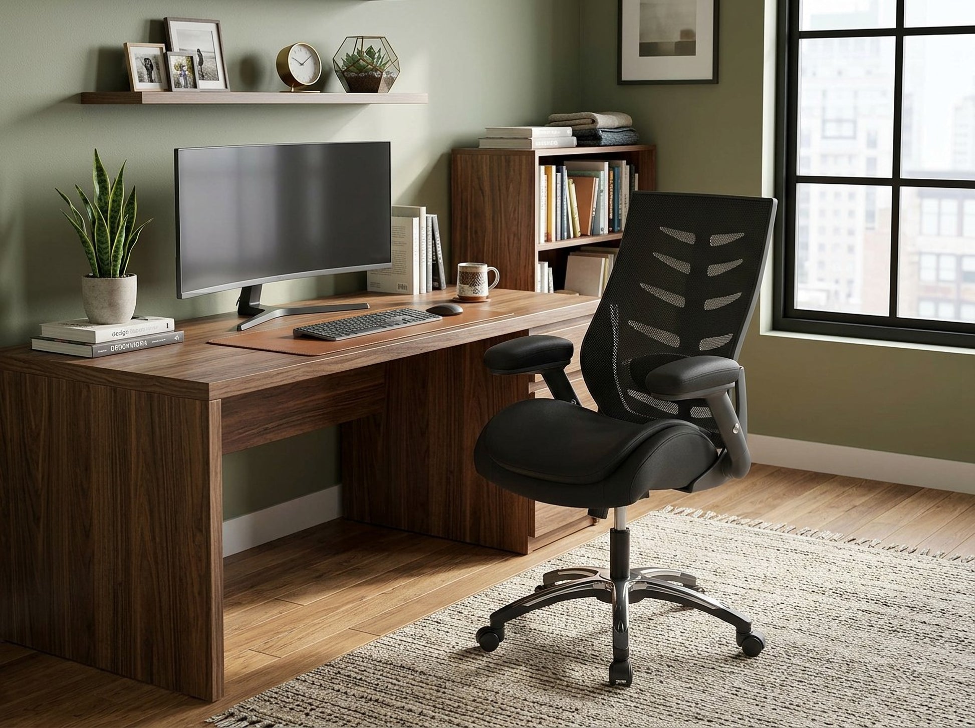 • Height-adjustable flip-up arms for flexible desk access and forearm support