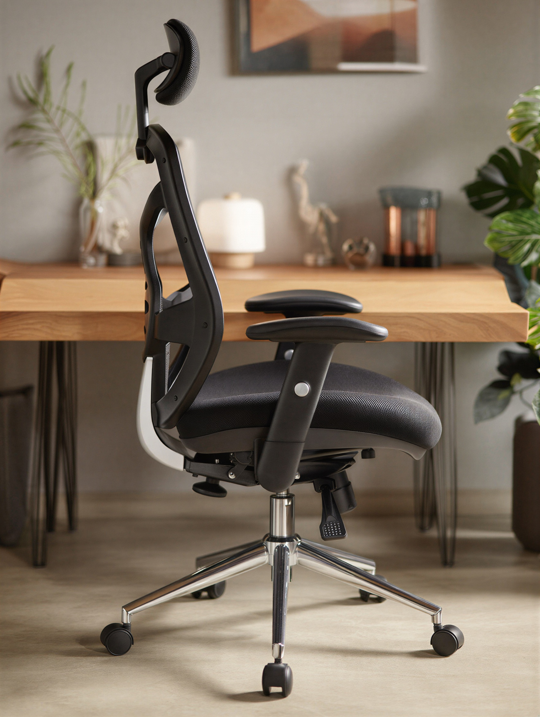 A statement executive mesh chair with plush comfort – The Polaris Mesh Chair blends a sculpted high-back mesh design with a substantial adjustable headrest and a posture-curved upholstered seat for a premium, boardroom-ready look that still feels supportive for everyday desk work. Chrome-effect detailing and a polished spider base give it a refined finish suited to premium home offices and executive suites.